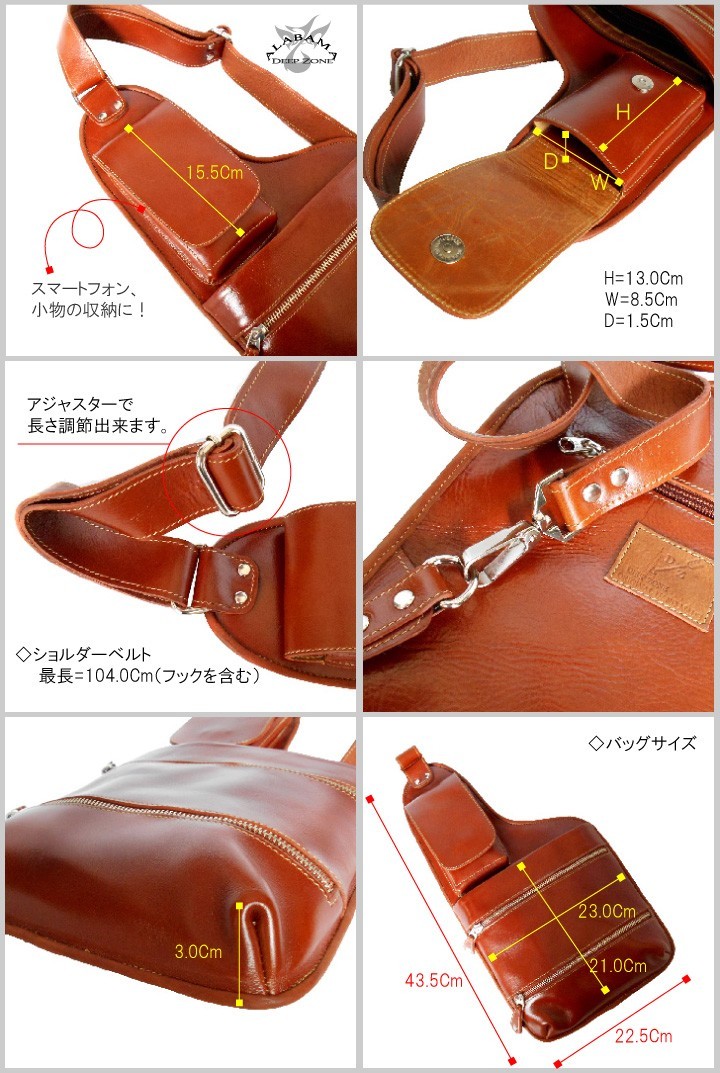 Deep Zone ワイルドでセクシーを上品にまとめる男のレザーブランド。 自分買いからプレゼントにも人気でオススメです。一流革職人がハンドメイドで仕上げられた、 本革 レザー ボディバッグ、ワンショルダーバッグ【素材】 牛革 金具:合金製 【サイズ】高さ:約43.5cm 幅:約22.5cm マチ:約3.0cm【カラー】ブラウン・ブラック独特の艶と輝きを放つイタリアンレザーは、非常に魅力的な素材感!長年の実績と経験を積んだ熟練職人達が、優美な気品と高いクオリティを生みだして作られたボディバッグ!財布、スマートフォン、車のキーや手帳、等の小物をスタイリッシュに持ち運びできます。背中にまた、脇にとスタイル色々お洒落感度アップ!シンプルマインドに可愛さと大人の高級感を表現しており使い込むほどに深まるレザーの味わいを楽しめます。本革 メンズ レザー ボディバッグ ワンショルダーバッグ 男女兼用