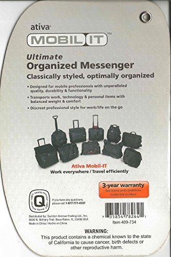 -. Binding : Electronics -. Brand : Ativa -. Color : Blck -. EAN : 0735854783365 -. Feature : Deep, expandable pockets keep drives, cables and connectors neat and organized. Mesh bag for connectivity and power accessories. / Zippered closures at top and bottom for easy access. / Fits laptop up to 16". Laptop compartment has a tight, supportive structure for secure storage. / Elastic detailing with room for a water bottle. Stays secure with a VELCRO® strap. / Leather-wrapped handle with cushioning has comfortable grip for easy portability. Removable shoulder strap with memory foam cushioning for comfortable carrying. Made of durable 1680 denier nylon. -. Label : Ativa -. Manufacturer : Ativa -. MPN : 586-062 -. PartNumber : 586-062 -. ProductGroup : PC Accessory -. ProductTypeName : CARRYING_CASE_OR_BAG -. Publisher : Ativa -. Studio : Ativa -. Title : Ativa Mobil-IT Ultimate Professional Quality Business / Computer Case, 18.5"H x 13.5"W x 6"D, Black Item # 586062 -. UPC : 735854783365