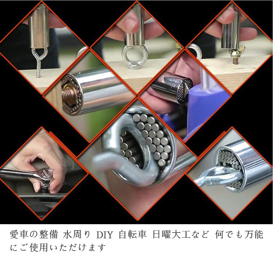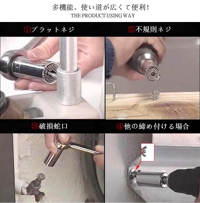 ・ナットやフックの形状に自動で合せて、どんなネジでも簡単に締めたり緩めたりでき、多数のソケットを替えずに作業ができ、時間短縮と効率アップに繋がります。スペース節約にもなりますので工具箱がスッキリできます。自転車の修理から日曜大工まで、出張修理や緊急時にも威力を発揮します。特に緊急救助作業などの防災用としてお手元にご準備しておけば安心ですね。