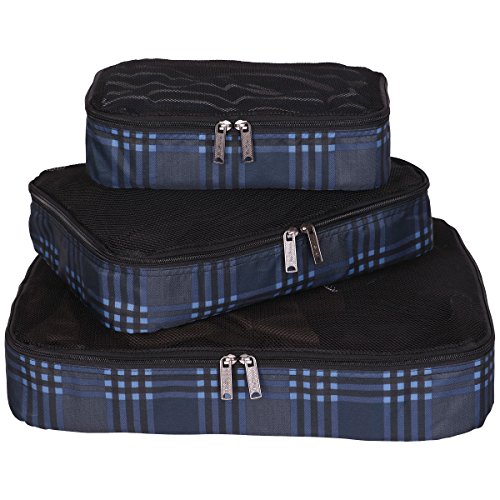 Designer 300d printed polyester ultralight packing cube small/ medium/ large 3-piece set. This set includes three packing cubes for clothing compression and accessory organization for more organized travel. Travel with ease of mind knowing all of your travel essentials are right where you want and need it to be. Three piece set consists of a small (11x7x3in), medium (14x10x3in), and large (18x13x3in) size cube all made to accommodate and organize all needed packed belongings. This travel set includes ultra light weight, durable, colorful printed polyester packing solutions for organized travelers. Lightweight 300d printed polyester exterior with fully finished interior. Snag-free performance and durability. Breathable soft mesh on lid for easy identification of contents and ventilation. Soft see-through mesh won't damage delicate fabrics. Zip around construction allows for easy access to main open compartments that are designed to fit an assortment of travel essentials. Convenient top webbed grab handle for easy portability. Premium self-repairing zippers designed for long-lasting use.Feature