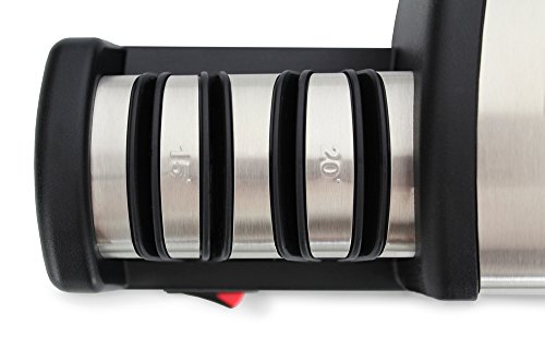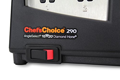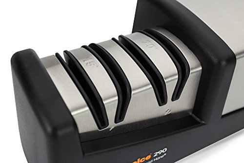 The new, Chef's Choice Hybrid Angle Select Diamond Hone 290 knife sharpener provides Edge Craft's most advanced Hybrid technology for the ultimate razor sharp edges on all your 15 Degree and 20 Degree class knives. Combining electric and manual sharpening stages, it is ideal for sharpening traditional European/American 20 Degree class household knives and Asian Style and other 15 Degree class knives. From straight edge and serrated blades to light sports knives and pocket knives, this affordable sharpener uses angle guides and 100% diamond abrasives in all three stages to apply an extremely sharp, arch-shaped edge that is stronger and more durable. Using the advanced, efficient Criss-Cross sharpening technology, the Hybrid 290 provides a superbly sharp edge with lots of "bite." Its 100% diamond abrasive wheels sharpen simultaneously "into" and "out-of" the edge for a superior burr-free edge. Stages 1 and 2 are electric with Stage 1 dedicated to 15 Degree edge knives and Stage 2 for 20 Degree knives. Stage 3 is used for polishing both types of knives as well as for sharpening serrated knives. Safe for all quality knives, the Hybrid 290 is easy to use, requires no guesswork and will quickly sharpen even the dullest of knives. It's a stylish addition to any household with its elegant and durable brushed stainless steel cover and sleek design. Engineered and manufactured in the U.S.A.Feature