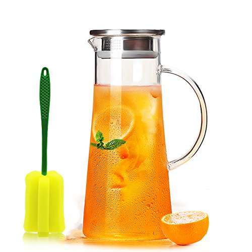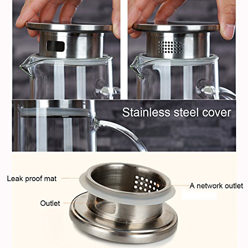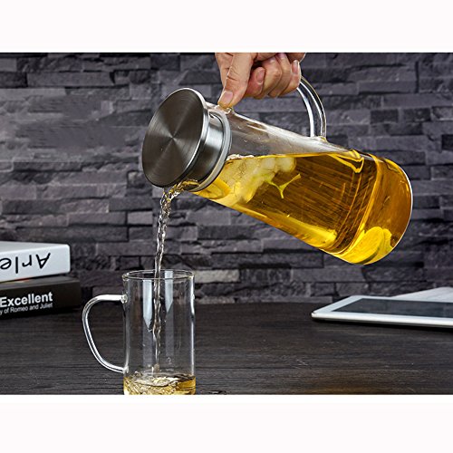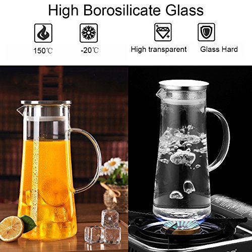 This pitcher has a stainless steel filter lid with a Silicone anti-leak mat that will allow you to pour your water without letting fruit into your glass. The pitcher is made from borosilicate glass which is lighter and stronger than regular glass, hand blown, heat-resistant(can bear temperature from -20℃ to 150℃) and 100% lead-free. We recommend using sliced strawberries, oranges, mango, lime, cranberries, raspberries, ginger, mint, cucumbers, melons, and pineapples! The Pitcher will make tasty, healthy hydration a pleasurable and convenient experience. Infused water is a great and tasty way to eliminate sodas and other unhealthy beverages from your meals.