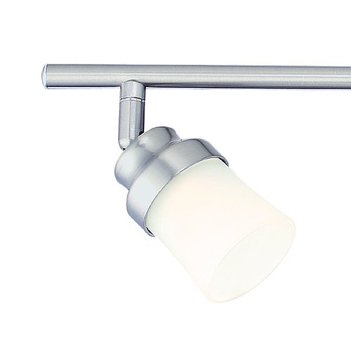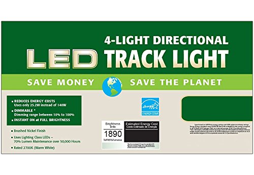 Envirolite LED track lighting is designed to complement any interior decor and save money. This kit comes with a straight bar and 4 modern shaped lights with frosted glass shades. This track lighting kit features a protective brushed nickel finish, and the LED lights pivot and rotate to direct the light where it is needed most. The LED light engine produces the same light as four 40-watt incandescent bulbs using only 25-watt of electricity to save you money, and there are no light bulbs to replace. These track lights are perfect for the living room, kitchen, bedroom and other rooms.Feature
