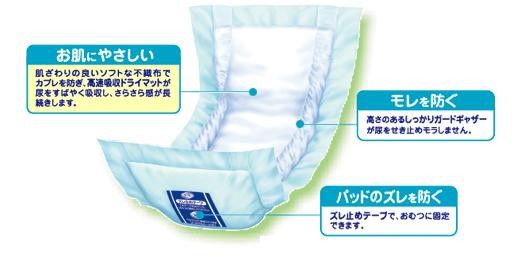 | 肌ざわりの良い不織布でかぶれを防ぎ、高速吸収ドライマットが尿をすばやく吸収します。 |