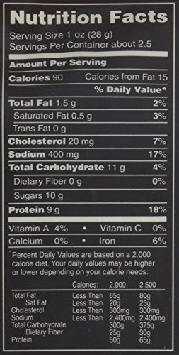 ReleaseDate : 2017-03-17 Studio : Hershey Foods Publisher : Hershey Foods Binding : Grocery Product Description Our garlic chili pepper beef jerky is for those who savor spicy flavor. A robust garlic and chili marinade soaks each tender slice of top round sirloin domestic beef, and is finished with real chili flakes to pack an extra punch. The result is a moist, tasty jerky that teases your taste buds with flavors of garlic, light salt, medium soy sauce and a crescendo of spices. 0