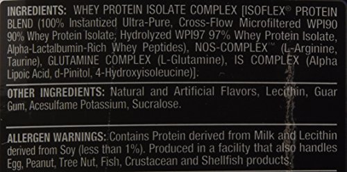 SOFLEX is a high quality whey protein isolate. Unlike other inferior protein powders on the market ISOFLEX doesn't include whey protein concentrate. Whey protein isolate is a superior form of protein and is included to ensure you reach your goals. Holding ourselves to the highest standard ISOFLEX protein powder is manufactured in a licensed, tested and government inspected pharmaceutical facility ensuring product quality and integrity. We provide both ground-breaking science and the ultimate grade of manufacturing quality and purity. Every ingredient added and every lot produced is independently lab tested for purity and potency ensuring consistent quality every time. ISOFLEX combines four proprietary delivery systems. The ingredients in each system work synergistically to provide a high-quality and great-tasting protein powder. The four systems of ISOFLEX: * WPI (Whey Protein Isolate) Complex [WPI FortifiedTM]: CTP (Cold Temperature Process), cross-flow microfiltered whey protein isolate, WPI (97% Whey Protein Isolate) and SynermuneTM Colostrum, a natural source of EGF, IGF-1 (growth factor). This high-quality whey protein isolate complex can help you reach your body-shaping goals. * NOS Complex [Ultra-Flow DeliveryTM]: Contains L-Arginine, Folic Acid and N-acetyl-cystine (N.A.C). Designed to increase blood flow and increase Nitrogen and Whey peptide delivery. It can also boost nitric oxide levels, thereby speeding up recovery and protein delivery to muscle tissues. * Glutamine Complex [GLUTAMAX TECHNOLOGYTM]: Naturally occurring glutamine peptides. Designed to improve recovery and provide immune support. * IS Complex [Rapid AbsorptionTM]: Alpha Lipoic Acid (ALA), d-Pinitol and 4-Hydroxylsoleucine. Designed to increase insulin receptor sensitivity, enhance rapid protein uptake and support healthy insulin function.Feature