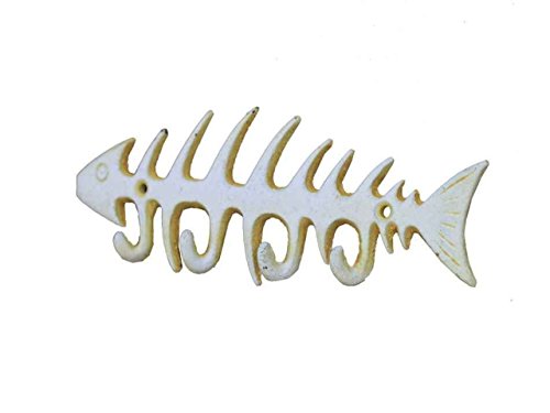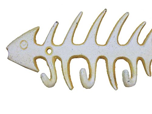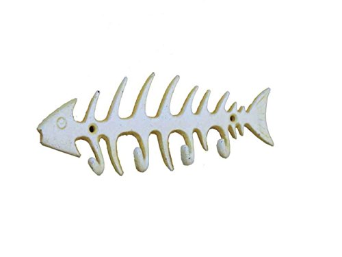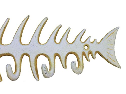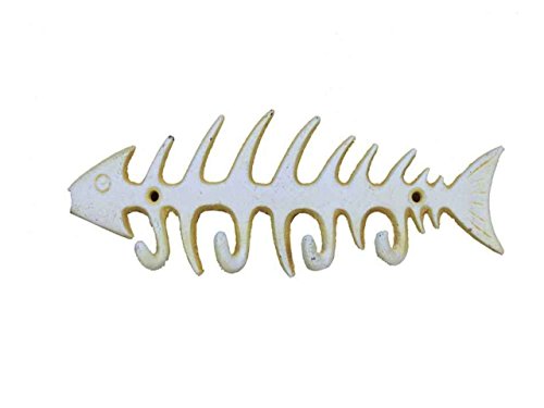 Hampton Nautical Cast Iron Fish Bone Rustic Wall Art Key Rack, 8", Antique White