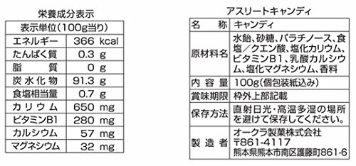 原材料:水飴、砂糖、パラチノース、食塩/クエン酸、塩化カリウム、ビタミンB1、乳酸カルシウム、塩化マグネシウム、香料
