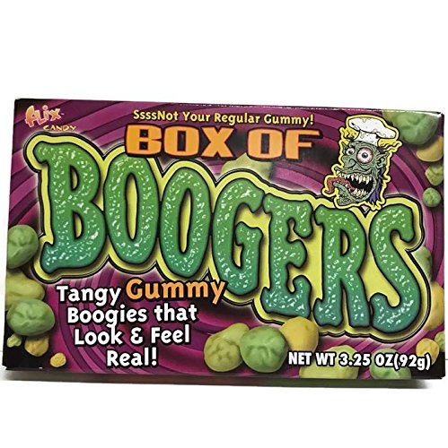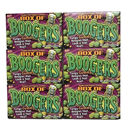 -. Binding : Misc. -. Brand : Flix Candy -. Color : Green -. EAN : 0038252370398 -. Feature : Ssssnot Your Regular Gummy! / Tangy Gummy Boogies that Look & Feel Real! Picked out Especially for you. / Great Classroom Halloween or Birthday handout or gross your friends and coworkers out at lunch. / Snottermelon, Sour Green Boogy, and Lemon Loogy Flavors / Perfect handout for Trick or Treat. Trick or Treaters will love these. Also makes a Funny gag Gift. -. IsAdultProduct : 0 -. Label : Flix candy -. Manufacturer : Flix candy -. PackageQuantity : 6 -. ProductGroup : Grocery -. ProductTypeName : GROCERY -. Publisher : Flix candy -. Studio : Flix candy -. Title : Box of Gummy Boogers (3.25 oz) 6 Pk -. UPC : 038252370398