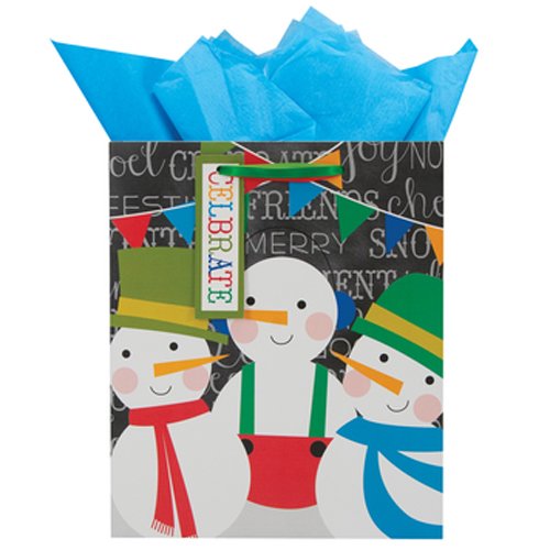 - Bright and cheery snowman pattern with coordinated gift tag and multi-strand ribbon handles