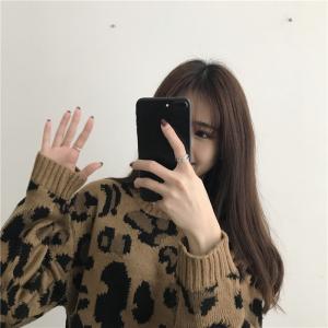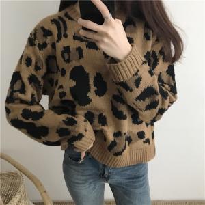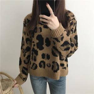 ニットトップス ニットプルオーバー レオパード柄 ヒョウ柄 アニマル柄 セーター 長袖 ラウンドネック 秋冬 丸首