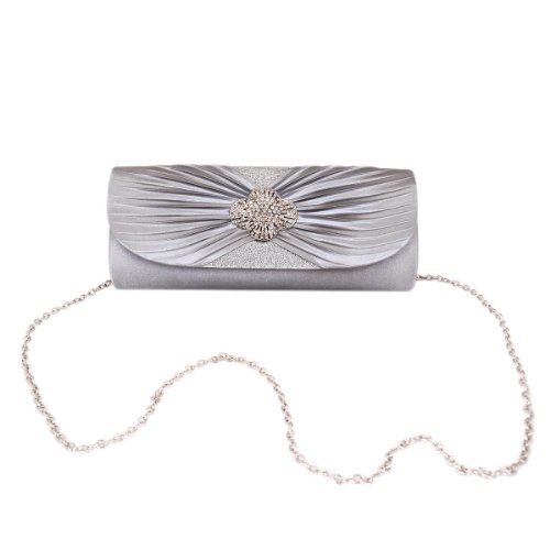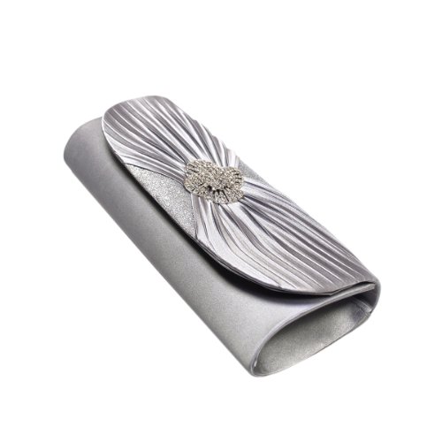 Elegant Cross Pleated Satin Flap Crystal Clutch Evening Bag, Silver Grey