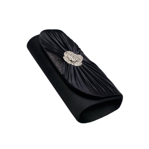 This premium quality evening clutch is both elegant and stylish. Pleated satin fabric front with sparkling crystal rhinestones center. fully lined with magnetic-flap closure and inner wall pocket. Removable hideaway shoulder chain strap with 22" drop. Pretty, functional and versatile. The size is 10.25" (L) x 4" (H) x 2" (W). Elegant design and luxury feel. A must have accessory for the perfect night out.