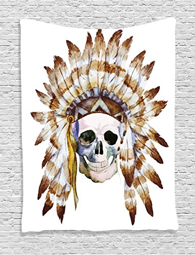 Ambesonne Skulls Decorations Collection, Native American Skull Indigenous Dead Man Watercolor Image with Feathers Ethnic, Bedroom Living Room Dorm Wall Hanging Tapestry, Brown White
