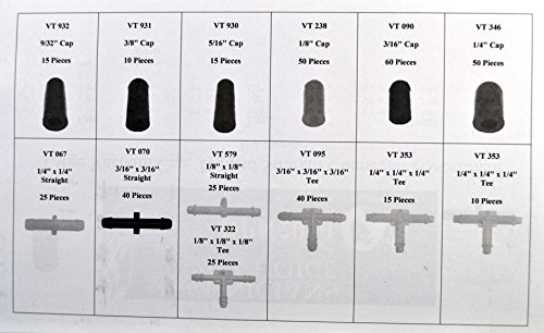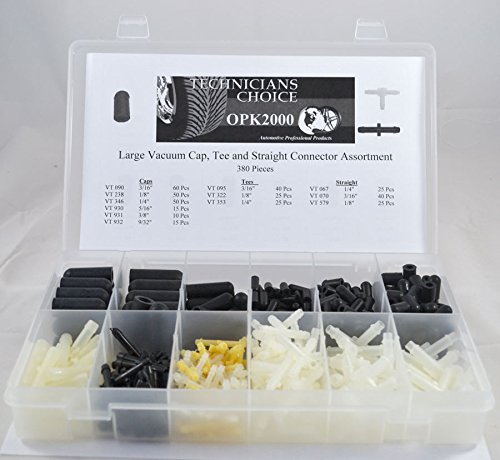 OPK2000 Large Vacuum Tee, Cap And Connector Assortment (380 Pcs) 25 - VT067 - Straight Vacuum Connector 1/4" x 1/4" 40 - VT070 - Straight Vacuum Connector 3/16" x 3/16" 60 - VT090 - Rubber Vacuum Cap 3/16" 40 - VT095 - Vacuum Tee 3/16" x 3/16" x 3/16" 50 - VT238 - Rubber Vacuum Cap 1/8" 25 - VT322 - Vacuum Tee 1/8" x 1/8" x 1/8" 50 - VT346 - Rubber Vacuum Cap 1/4" 25 - VT353 - Vacuum Tee 1/4" x 1/4" x 1/4" 25 - VT579 - Straight Vacuum Connector 1/8" x 1/8" 15 - VT930 - Rubber Vacuum Cap 5/16" 10 - VT931 - Rubber Vacuum Cap 3/8" 15 - VT932 - Rubber Vacuum Cap 9/32" 1 - PB45 - Plastic Box - Twelve Compartment 10 5/8" x 6 1/4" x 1 1/2"