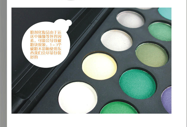 Cost-effective: 1. Tone combination of well-designed, with color eye shadow, smoky eye shadow texture is light and not sticky, good adhesion; delicate and smooth, add pure color eye sparkles, either alone or with a heart, will make you stunning touching .2. single eye shadow powder diameter to 16mm, matte plastic box double powder dish, matte eyeshadow, pearl eyeshadow contains a small amount of metal and warm color eyeshadow .3. with multicolor fumes eye shadow, design a unique optional color effect, easy to color not easy to fade, exquisite packaging, multi-layer bubble bags and customized cartons to protect the make-up box, makes it difficult to damage.