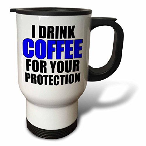 3dRose I Drink Coffee for Your Protection, Blue Travel Mug, 14 oz, Stainless Steel, White