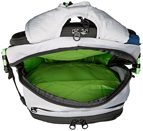 -. Feature : 30 liter capacity / External fleece lined laptop section / Compression/skate straps / Adjustable sternum strap / Air mesh shoulder straps and back panel / Pockets: 4 interior slip, 1 interior zip, 5 exterior