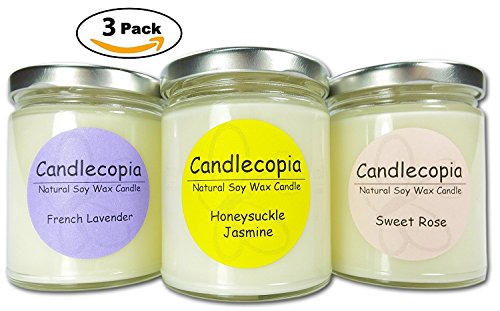Candlecopia Honeysuckle Jasmine, French Lavender and Sweet Rose Strongly Scented Hand Poured Vegan Soy Candles, Dye Free, 3-Pack