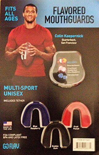 Product Description These mouthguards will help protect your teeth if you play contact sports. Some of the features listed: - One size that you can trim to fit - Can be used for all sports - Unisex - FDA Compliant - BPA and Latex Free - Not Designed for braces - $1600 Dental Warranty The set includes 3 multi-sport mouthguards in the following flavors: - 1 Fruit Punch - 1 Bubble Gum - 1 Blue Raspberry A Carrying Case is also included. Made in USA. 0