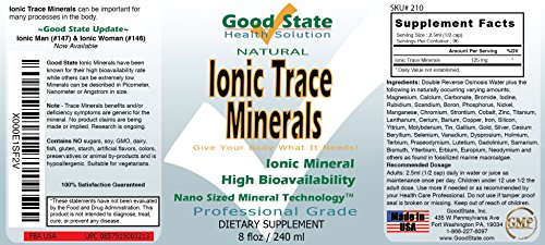 -. Binding : Health and Beauty -. Brand : Good State -. EAN : 0857515003213 -. Feature : Absorbs Much Better than Pills! / Professional Grade - Natural - Made in USA / This product is suitable for vegetarians. / Easy to mix with Juice or Water / Good for overall body health -. IsAdultProduct : 0 -. Label : Good State -. Manufacturer : Good State -. Model : 210 -. MPN : 210 -. NumberOfItems : 1 -. PackageQuantity : 1 -. PartNumber : 210 -. ProductGroup : Health and Beauty -. ProductTypeName : HEALTH_PERSONAL_CARE -. PublicationDate : 2014-10-02 -. Publisher : Good State -. Studio : Good State -. Title : Good State-Liquid Ionic Trace Minerals 8 fl. oz. -. UPC : 857515003213