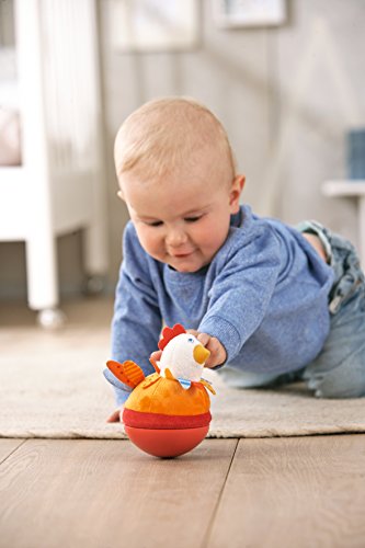 Cluck cluck cluck! Roly poly chicken is soft as can be and has hatched just in time your little one's next floor-play session. Makes an engaging jingle sound when nudged. Plastic base allows toy to wobble to and fro without falling over. 4.5" high, 3.75" around the belly.