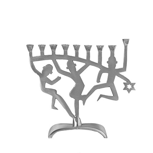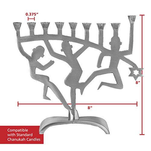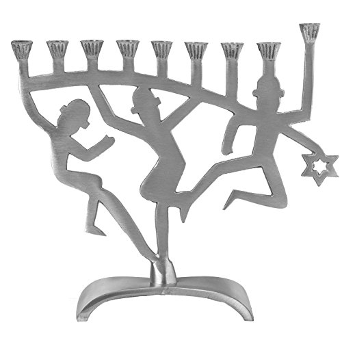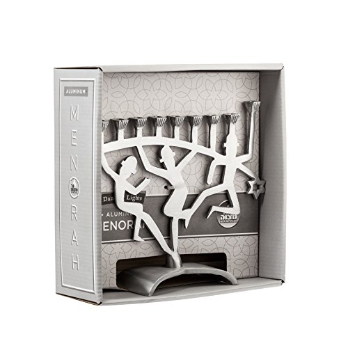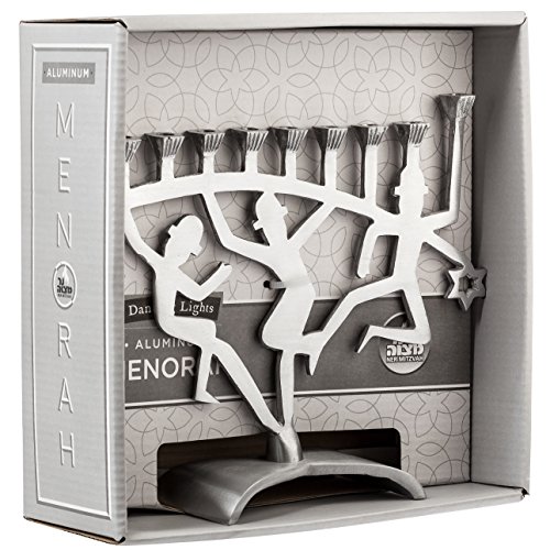 DANCING LIGHTS: Mesmerizing candle lights jive with melodies of “Hanerot Hallalu.” Dancing figurines bring both senses to light & ground this aluminum menorah with a sturdy base.