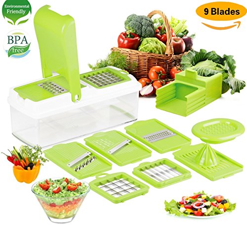- ★9 IN 1 KITCHEN TOOLS SET - Support more than 10 functions, such as peeling, cutting into shreds, cutting into small pieces, cut into 4 equal pieces, cut into 8 equal pieces, slicing, dicing, grating, chopping etc..Includes a variety of thick and thin slicing options, fine and coarse grating and shredding options. Made of first-grade BPA free ABS food-safe plastic and certified by FDA.