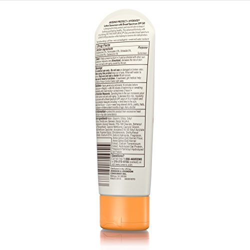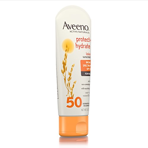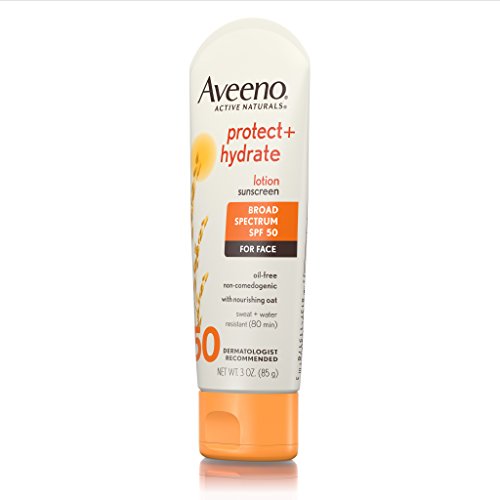 Aveeno Protect + Hydrate Face Sunscreen with Broad Spectrum SPF 50 provides hydration and sun protection to keep skin feeling soft, smooth, and healthier. This sunscreen lotion, combined with nourishing Active Naturals Oat, delivers broad spectrum UVA and UVB sun protection while hydrating skin. For use on face and body, the formula is fast-absorbing, oil-free, non-comedogenic, and sweat- and water-resistant for 80 minutes.