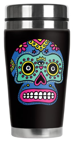 Mugzie Blue Sugar Skull Travel Mug with Insulated Wetsuit Cover, 16 oz, Black