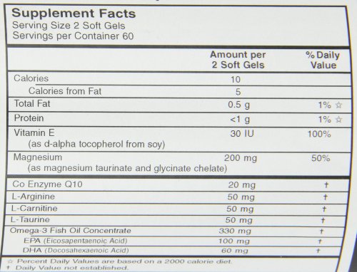 -. Feature : To Promote and Maintain Healthy Heart Rhythm / Preservative-free / Dietary Supplement / Serving Size 2 soft gels Serving Size: 2 soft gels / 120 Softgels