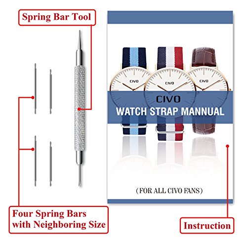 PERFECT CONSTRUCTION, EASY TO INSTALL, WATER PROOF AND WASHABLE: Stitched construction and laser cut to eliminate fraying; unlike other Knockoffs using glue and cheap stitching will cultivate bacteria, our CIVO watch band is Stink resistant and machine washable. And most important, we provide 1 high quality spring bar tool and 4 neighboring size stainless steel spring bars for you to change your watch band, which are worth at least $8 if you purchased separately from other sellers.