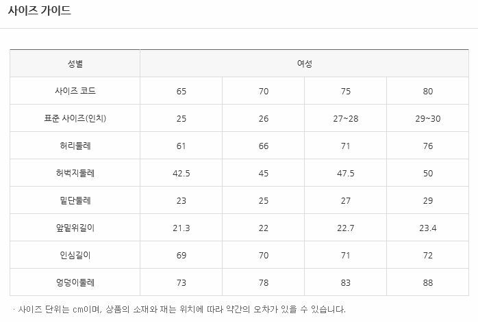 | 치수 | 실측(75)사이즈(cm)-허리둘레70 엉덩이둘레80 허벅지둘레44 밑단둘레27 총장96 |