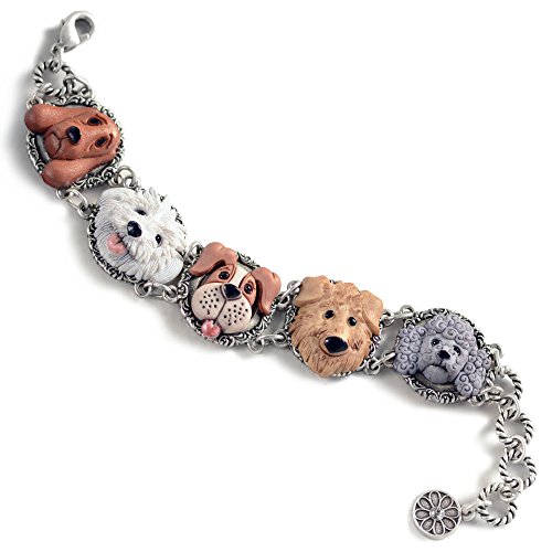 Five faces of wonderful dogs adorn this bracelet. Do you see a hound, terrier, boxer, retriever, poodle, bichon frise, maltese, maltipoo, bloodhound or beagle, perhaps? They are molded for detail and dimension, hand painted and mounted on the panels of our link bracelet. You're a dog person if you can identify each face on this bracelet as some canine you've known or loved or helped.