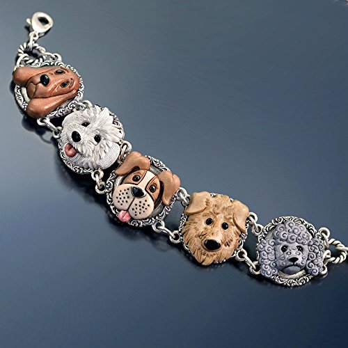 Five faces of wonderful dogs adorn this bracelet. They are molded for detail and dimension, hand painted and mounted on the panels of our link bracelet. Adjustable to fit 7" to 8" wrists, the bracelet has a burnished silver finish, is light weight and easy to clasp. So irresistible, that if you're contemplating a gift, you may want one for yourself, too!