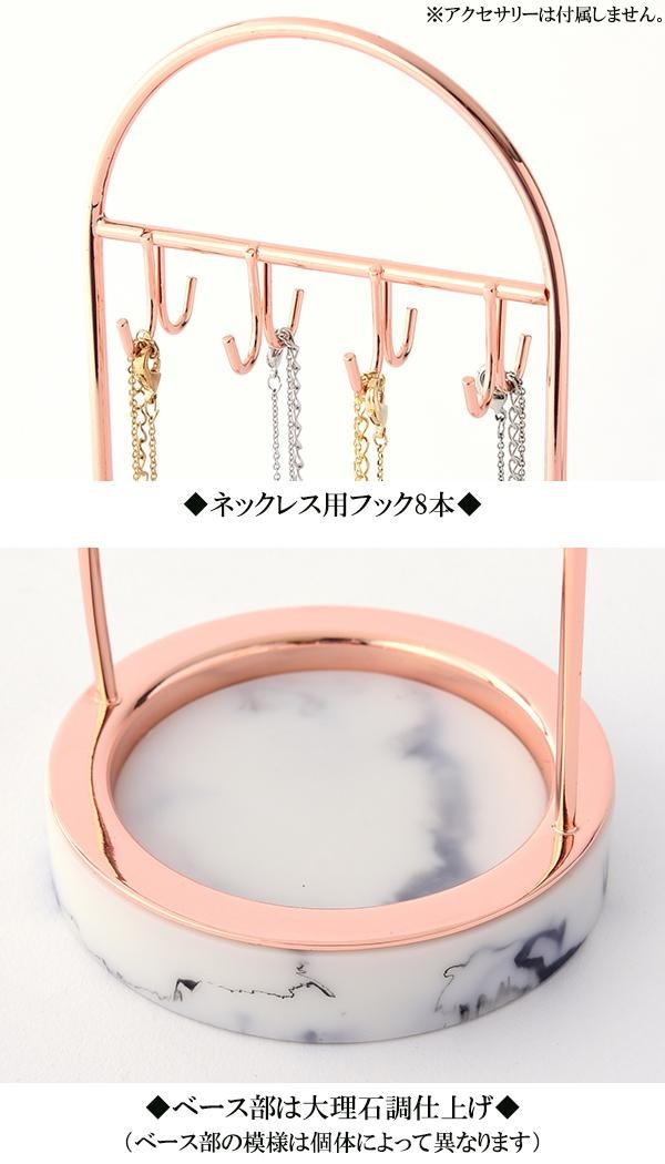 | ピンクゴールドの本体と大理石調のトレーの組み合わせがゴージャスなネックレススタンドです。ネックレスが絡まないフック式吊り下げ収納になっています。装いを華やかに彩るアクセサリーだからこそ、使わない時も美しく佇むギャラリーのような収納がお似合いです。ベース部は大理石調仕上げですので、個体によって模様は異なります。 |