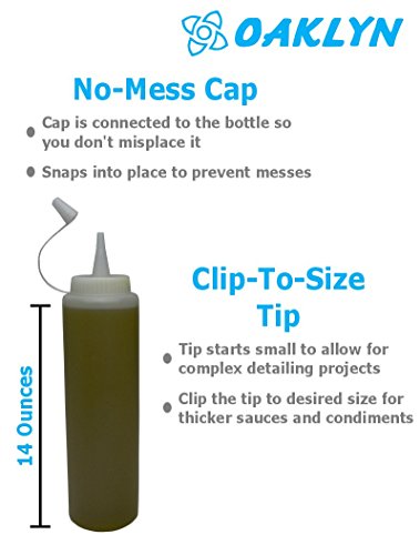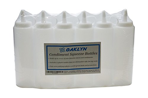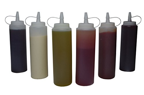 INCLUDES SIX, 14 OZ CLEAR SQUEEZE, SQUIRT BOTTLES made from HDPE plastic that is 100% BPA FREE. Slender design takes up less room in your fridge while holding the same amount of sauce as store bought bottles.