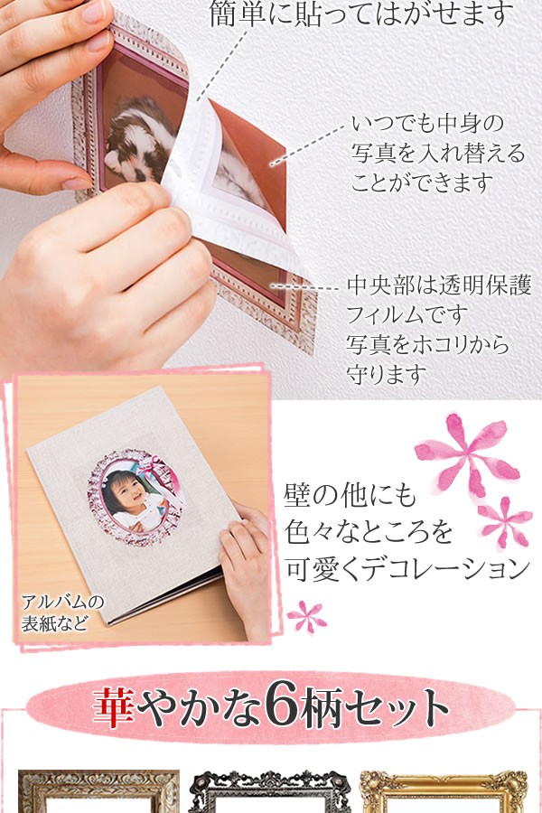 | 壁紙に貼ってはがせる額縁風のフォトフレームステッカー。お気に入りの写真を穴をあけず壁に飾れます。額縁風のフレームだからまるでギャラリーのような豪華さ。真中は保護フィルムになっているので写真をほこりや汚れから守ります。いろいろ楽しめる6柄入。写真/飾る/穴をあけない/簡単/キレイ/子供/ペット/家族/豪華/デコレーション/壁に貼る/壁/はがせる/賃貸/フォトフレーム/インテリア/額縁/ |