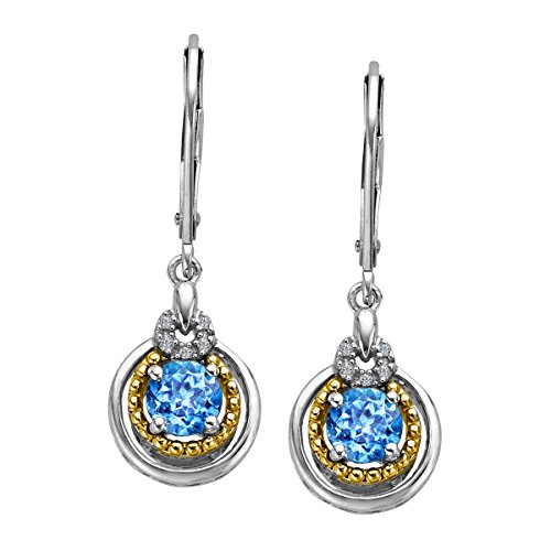 A vibrant shade of blue gives these earrings a stylish splash of color. Round-cut Swiss blue topaz totaling 1 1/4 ct accompanied by brilliant diamond accents are set in shining sterling silver and 14K gold. Pieces measure 1 3/16 by 3/8 inches.Feature