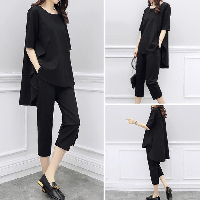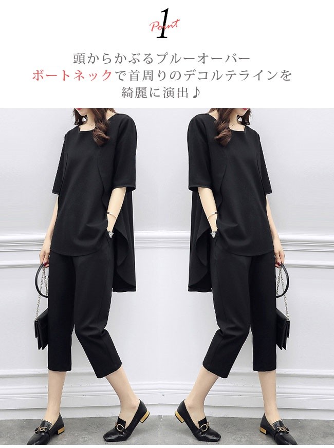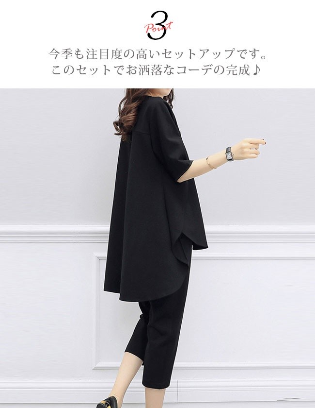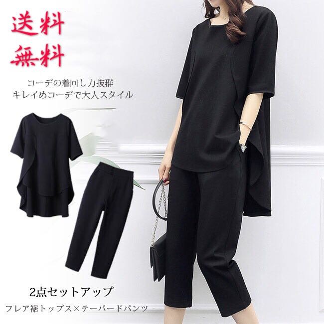 セットアップ レディース 夏 クロップドパンツ 七分丈 チュニック 半袖 前後アシンメトリー 大きいサイズあり aライン ゆったり ノーカラー ロングブラウン テーパードパンツ 上下セット 黒 ブラック 無地 大人 他と被らない きれいめ ゆる カジュアル【商品説明】誰にも受け入れられるようなきれいめスタイルをベースにして、ほど良くモードを取り入れて、派手過ぎず地味すぎない1セット☆単品を使い分けることができて、コーディネートの幅も広がっている◎