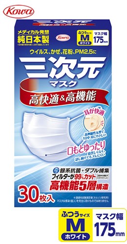 高機能・高品質の純日本製、1日使いきりタイプの不織布マスクです。口元の空間をキープし、口の動きにも柔軟に対応しています。ほおにできやすい隙間も低減し、ウイルス飛沫や花粉の侵入を強力にブロック!! 鼻のカーブに長時間しっかりフィットし、鼻の隙間からの侵入を防ぎ、さらにメガネのくもりも強力にブロックします。 |