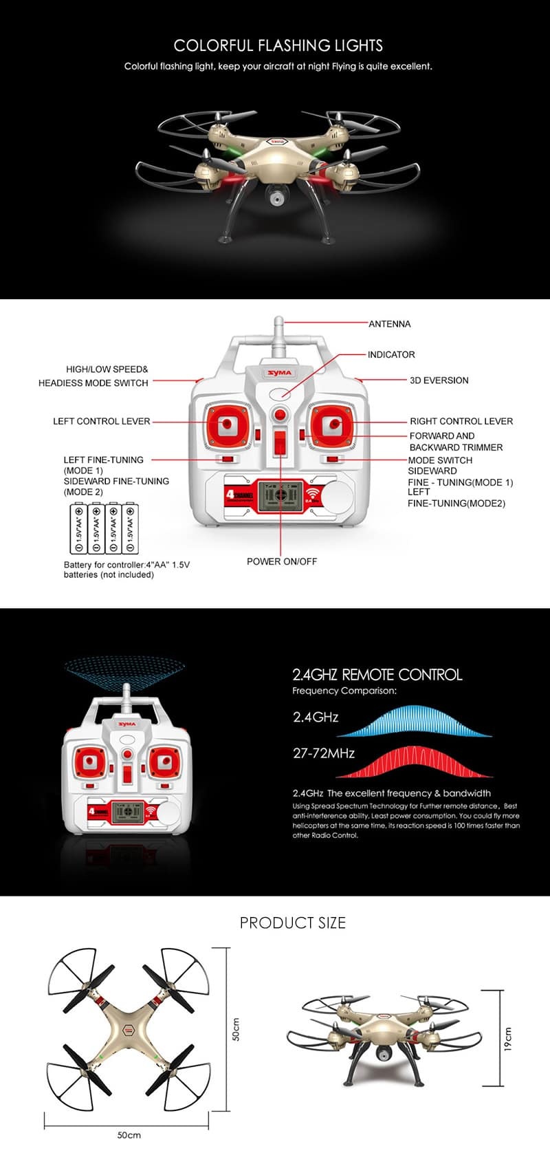 Specifications : * Frequency : 2.4Ghz * Channel : 4CH * Control Distance : 100m * Playing Time : about 7mins * Charging time : About 200mins * Battery : 7.4V 2000mAh Li-on * Battery for Transmitter : 4 x AA battery (not included) * Product Size : 50 x 50 x 19 cm * Battery Size : 9 x 3 x 1.5cm * Package Weight : About 1856g * Shipping Volume : 36 x 36 x 18cm ( 3900g )