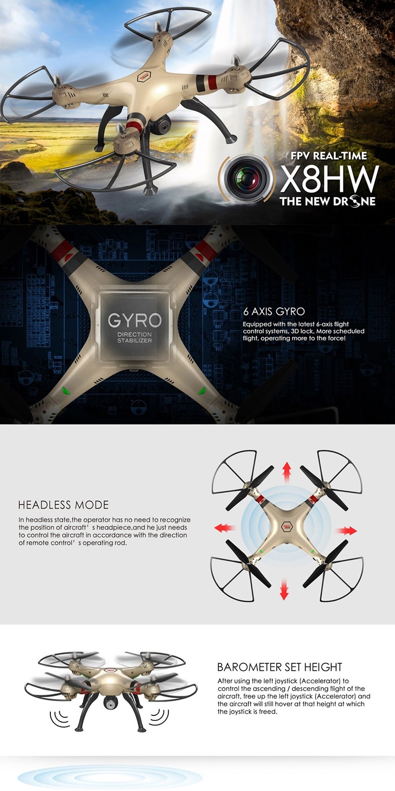 Satu-satunya Drone yang dilengkapi dengan feature Gyro Direction Sabillizer Processor yang canggih : - Mampu stabil di ketinggian tanpa dikontrol (Free Hands) - Fungsi Headless Mode untuk menentukan arah sehingga dapat dikontrol tanpa mempedulikan arah kepala depan belakang. - 360 Eversion untuk fungsi berputar dengan sempurna - Barometer Set Height : After using the left joystick to control the ascending / descending flight of the aircraft, free up the left joystick and the quadcopter will still hover at that height at which the joystick is freed.
