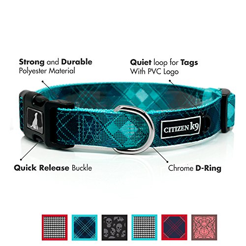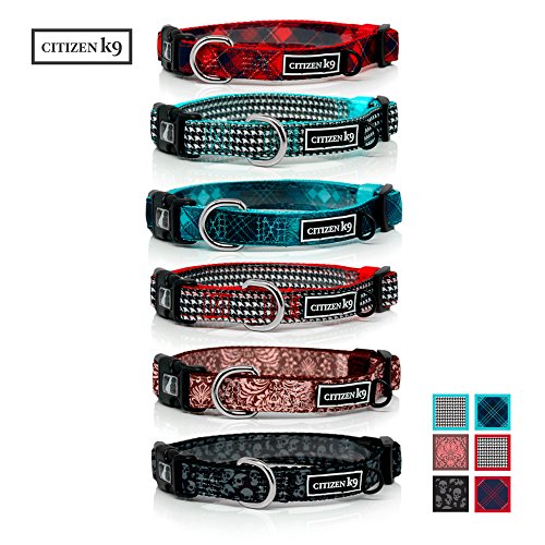 Studio : Buju Publisher : Buju Binding : Misc. Product Description Is your pet looking fly? Have some fun! Express a bit of personality, whether your pet is a friendly loving and loyal labrador retriever puppy, a bad to the bone pitbull, or a dainty siamese cat that needs a cute dog or cat collar, we've got you covered. Additional Features:< Patterns: Fancy vintage bling dog collars with unique retro patterns including: Houndstooth Red, Skulls Black, demask pink, and tartan blue plaid. Metal chrome quick release buckle that is made from 100% zinc and will not rust. Strong and safe 100% polyester tack stitched material makes for a high quality dog collar. Comfortable material that conforms to fit your pet's neck makes a nice dog collar or a fancy cat collar for your pet to lounge around in. Sizes x Small 9" to 12.5" .5" Small 11"-18" 5/8", Medium 13"-20" 3/4", and Large 16"-27" 1". Great designs for your male or female pet. Great for a girl or boy. Blue Plaid Tartan, Red Plaid Tartan, Red Houndstooth, Blue Houndstooth, Pink Flowers, Black Skulls Machine washable, air dry. Secure plastic quick release bucklenon-toxic materials Cool retro original dog collar patterns that are designed by graphic designer Dan Bucknam Buju Dog Collars Citizen k9 line Check out our promotions below and find a matching leash or complementary collar. Bundle and save with matching pet products Treat Your Dog or Cat Risk Free Today 100% money back guarantee. So click add to cart now and your pet will thank you later. 0
