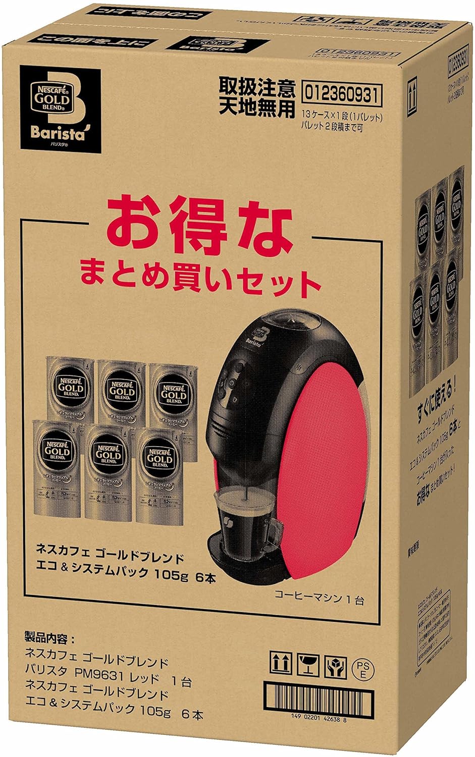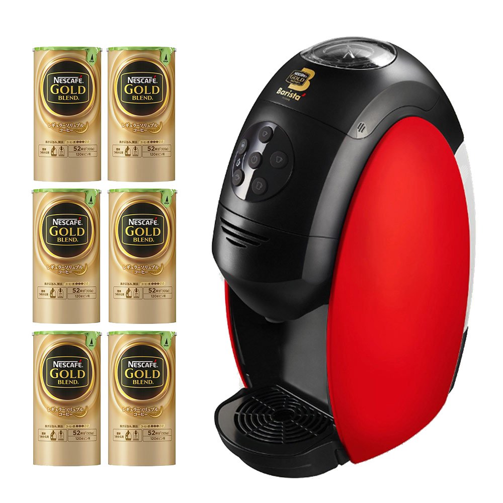 バリスタとゴールドブレンド約半年分(1日1杯~2杯程度飲む方)がセットになったお得なまとめ買いセットです。 ネスカフェ ゴールドブレンド バリスタとは:・ワンタッチで多彩なメニューが楽しめる・本格的なコーヒーが自宅で簡単に楽しめる・ブラックコーヒーはクレマがたつ・カフェラテ/カプチーノはふわふわの泡が楽しめる・お手入れが簡単・一杯型抽出マシンなので、毎回同様の本格的なクオリティを楽しめる・バリスタで淹れると、部屋に広がる香りが25%UP・レギュラーソリュブルコーヒーを使用するので淹れたての香りと味わいを実現・日本各地の有名シェフのお店でも提供されている