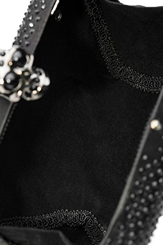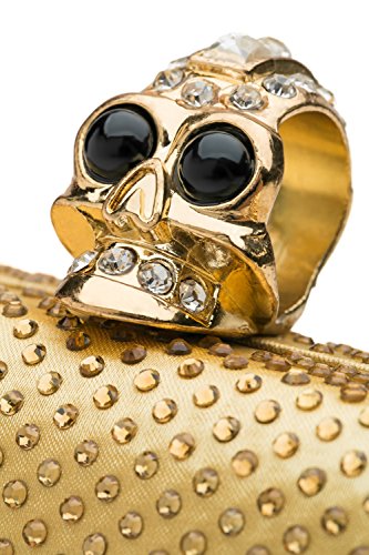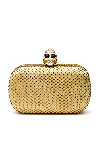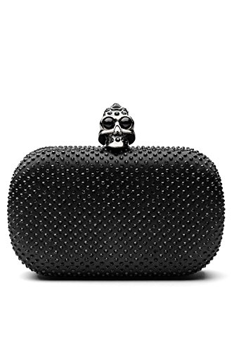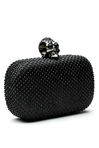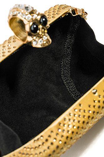 -. Feature : Clutch handbags come with metal hardware, detachable chain strap, skull shape clasp closure. / The hard case is covered with sheen satin and studded with crystals. It has velvet lining inside. / Removable chain strap allows you to wear the clutch purse as a crossbody bag that hits at the hip. / The clutch wallet is roomy enough to keep your cell phone, car keys, credit cards, lipsticks. / Approximate dimensions of the clutch box: 6.3"(L) x 2" (W) x 3.9"(H). Approximate chain length - 47"
