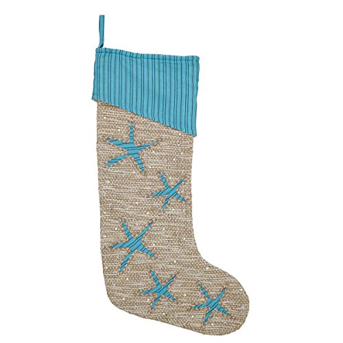 - Textured natural shade cotton jute fabric with appliqued starfish in robin egg blue seersucker striped fabric