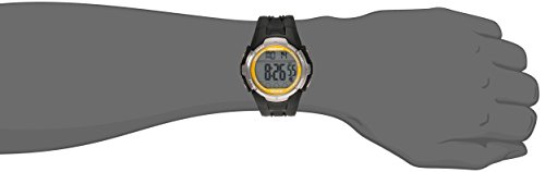 -. Feature : Round watch with silver-tone top ring featuring yellow dial borer, 24-hour stopwatch, and daily alarm / 45 mm resin case with acrylic dial window / Quartz movement with digital display / Resin band with buckle closure / Water resistant to 50 m (165 ft)