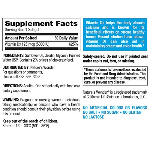 -. Title : Nature's Wonder Vitamin D3 125mcg 5000IU Soft Gels, 365 Count