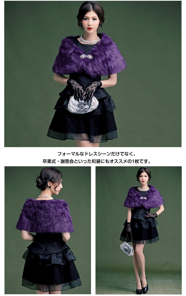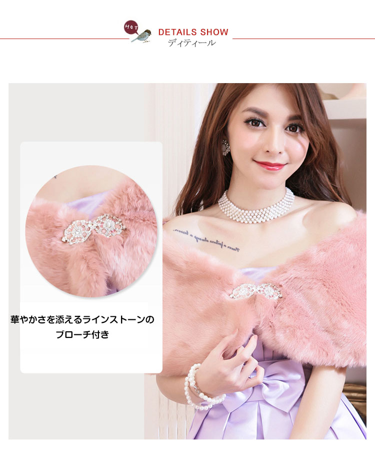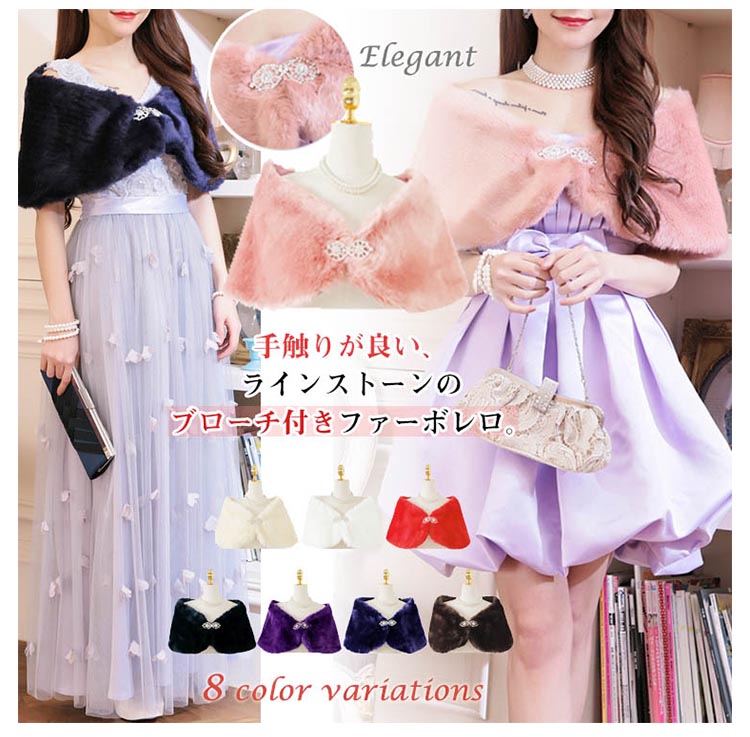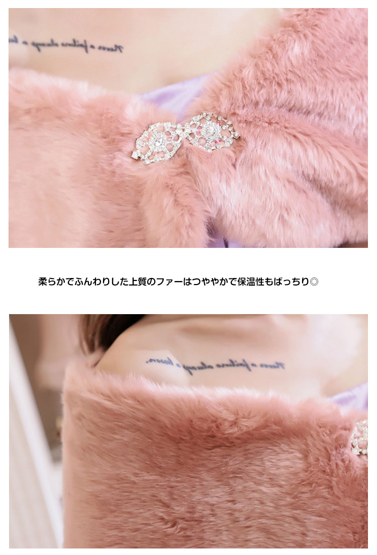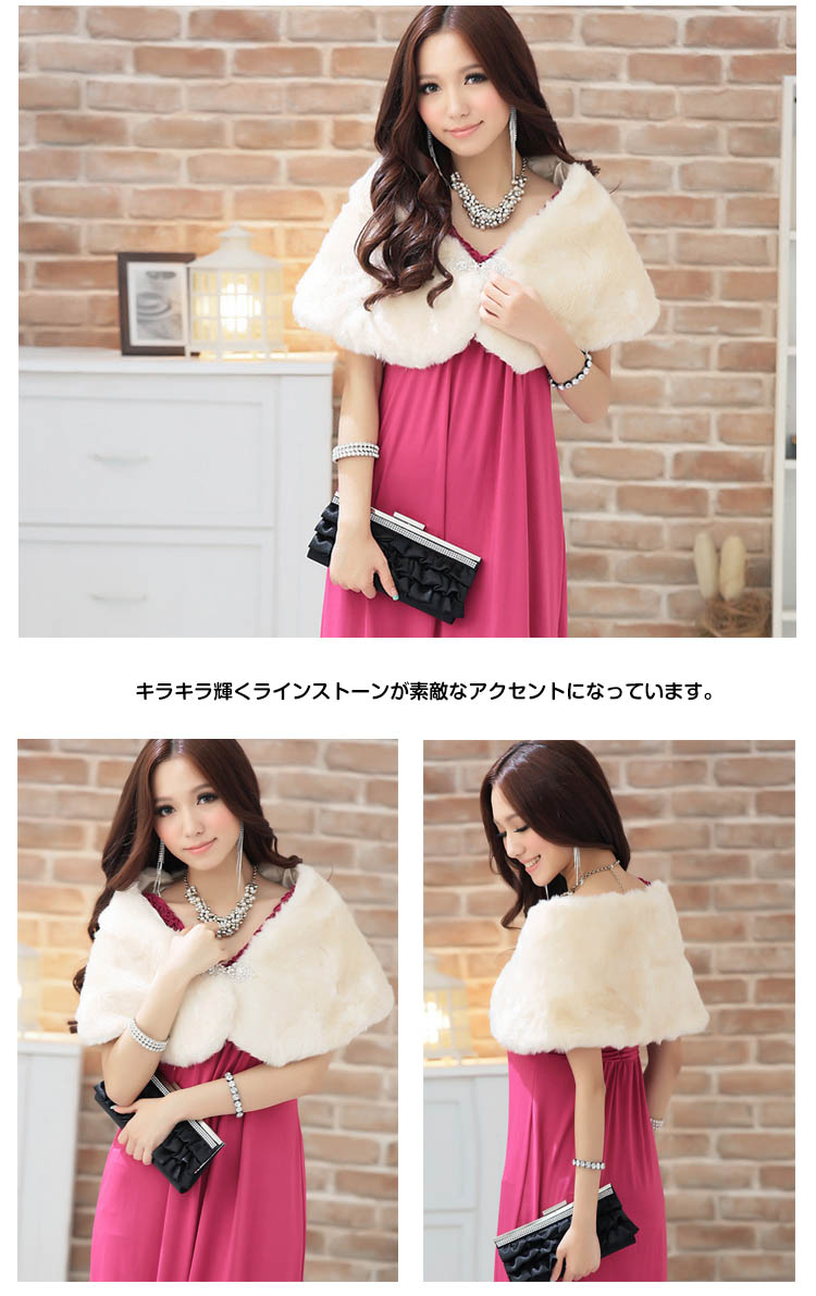 | 手触りが良い、ラインストーンのブローチ付きファーボレロ。柔らかでふんわりした上質のファーはつややかで保温性もばっちり◎Aラインに広がった裾がエレガントでフェミニンな印象に♪キラキラ輝くラインストーンが素敵なアクセントになっています。結婚式・披露宴・二次会・お呼ばれなどのイベントやフォーマルなドレスシーンだけでなく、卒業式・謝恩会といった和装にもオススメの1枚です。 | |